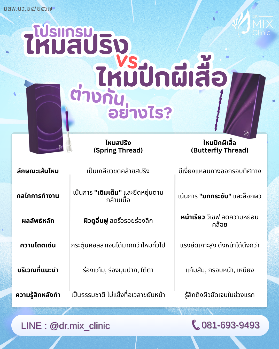 • กลไกการทำงาน: เมื่อร้อยเข้าไปใต้ผิวหนัง ตัวเกลียวจะช่วย "พยุง" และเติมเต็มชั้นผิวที่ยุบตัวลง นอกจากนี้ ความเป็นเกลียวช่วยเพิ่มพื้นที่ผิวในการกระตุ้นการสร้างคอลลาเจนได้มากกว่าไหมเส้นเรียบปกติ